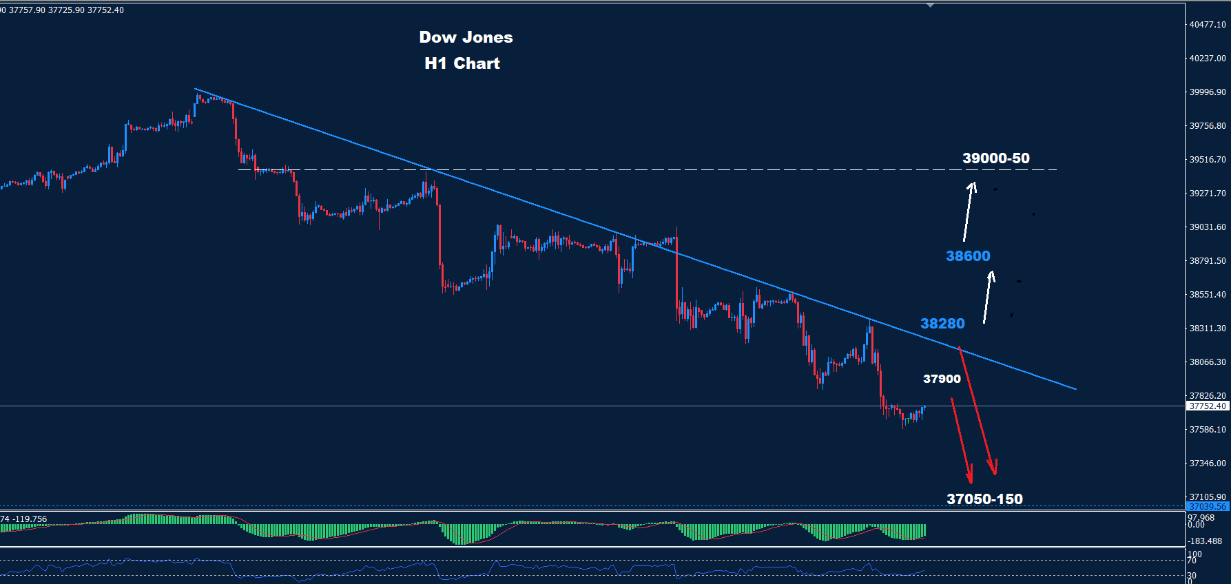 كما نرى على الرسم البياني، يواجه مؤشر داو جونز منطقة مقاومة للمدى اليومي تتراوح بين 380-38280 حيث طالما استمر السوق في الاحتفاظ بالتداولات تحت هذه المقاومة، فقد تستمر موجة الاتجاه الهبوطي نحو المنطقة 150-37050