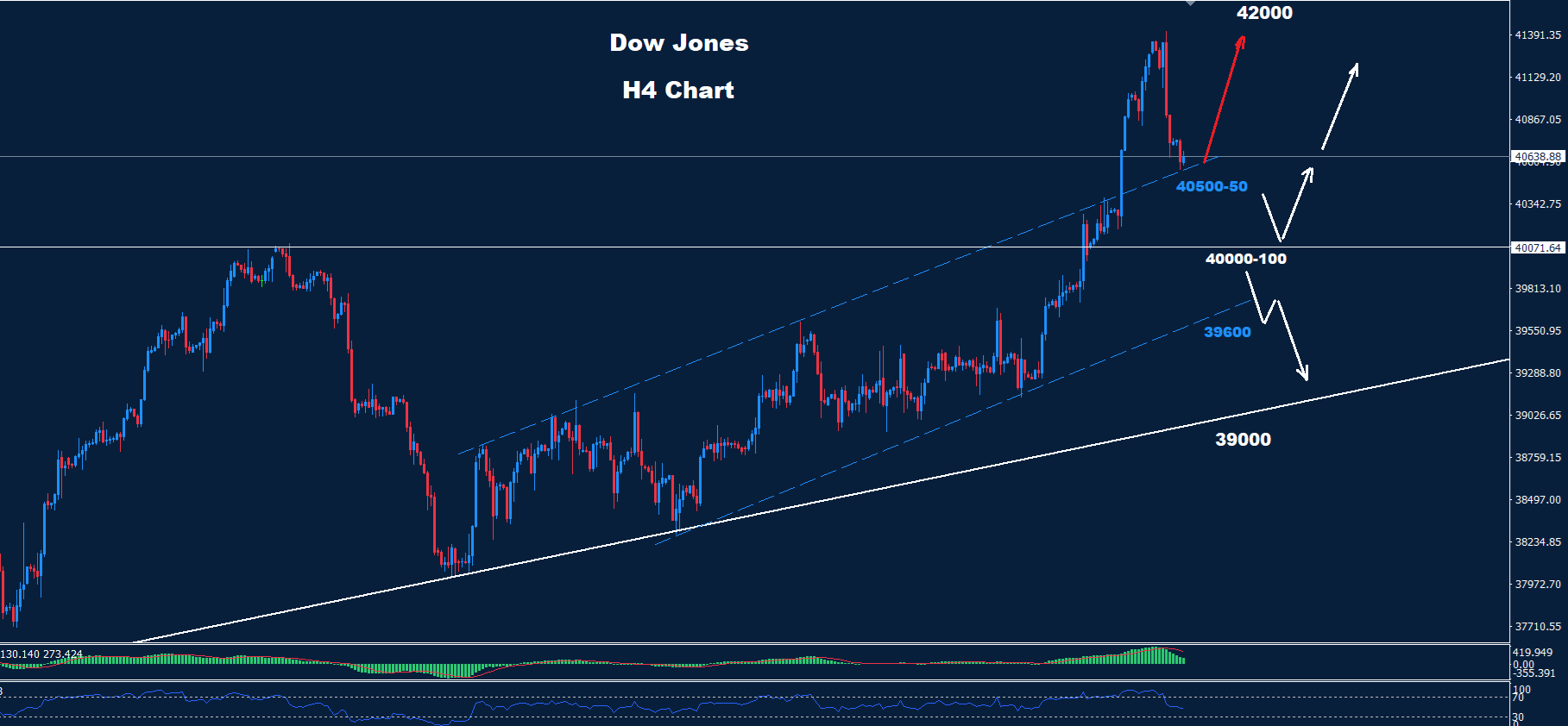 من المتوقع المزيد من الهبوط تحت 40000 نحو منطقة 39100 مع دعم يومي حول 700-39600