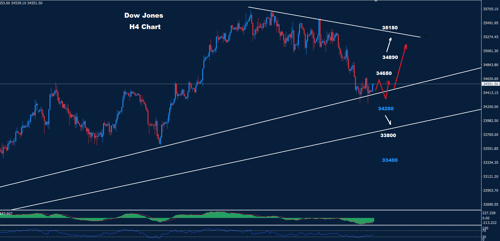 كما نرى بالرسم البياني فرصة لمنطقة التداول بين الدعم 34240 و 34650 قد تسيطر على السوق