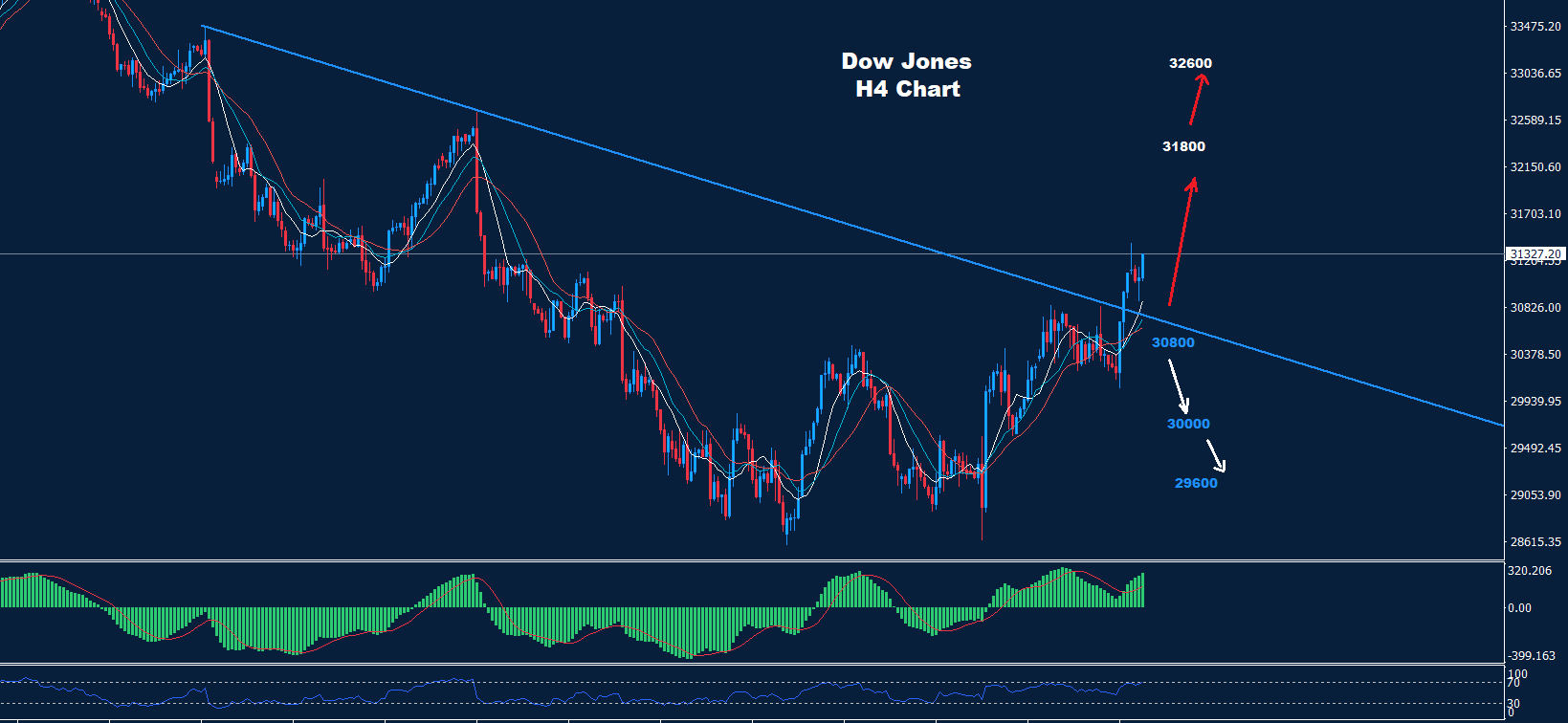 تمكن مؤشر الداو من تحقيق الهدف 100-31000 الأسبوع الماضي بينما تمكن في وقت مبكر اليوم من الارتفاع فوق مستويات 31300.