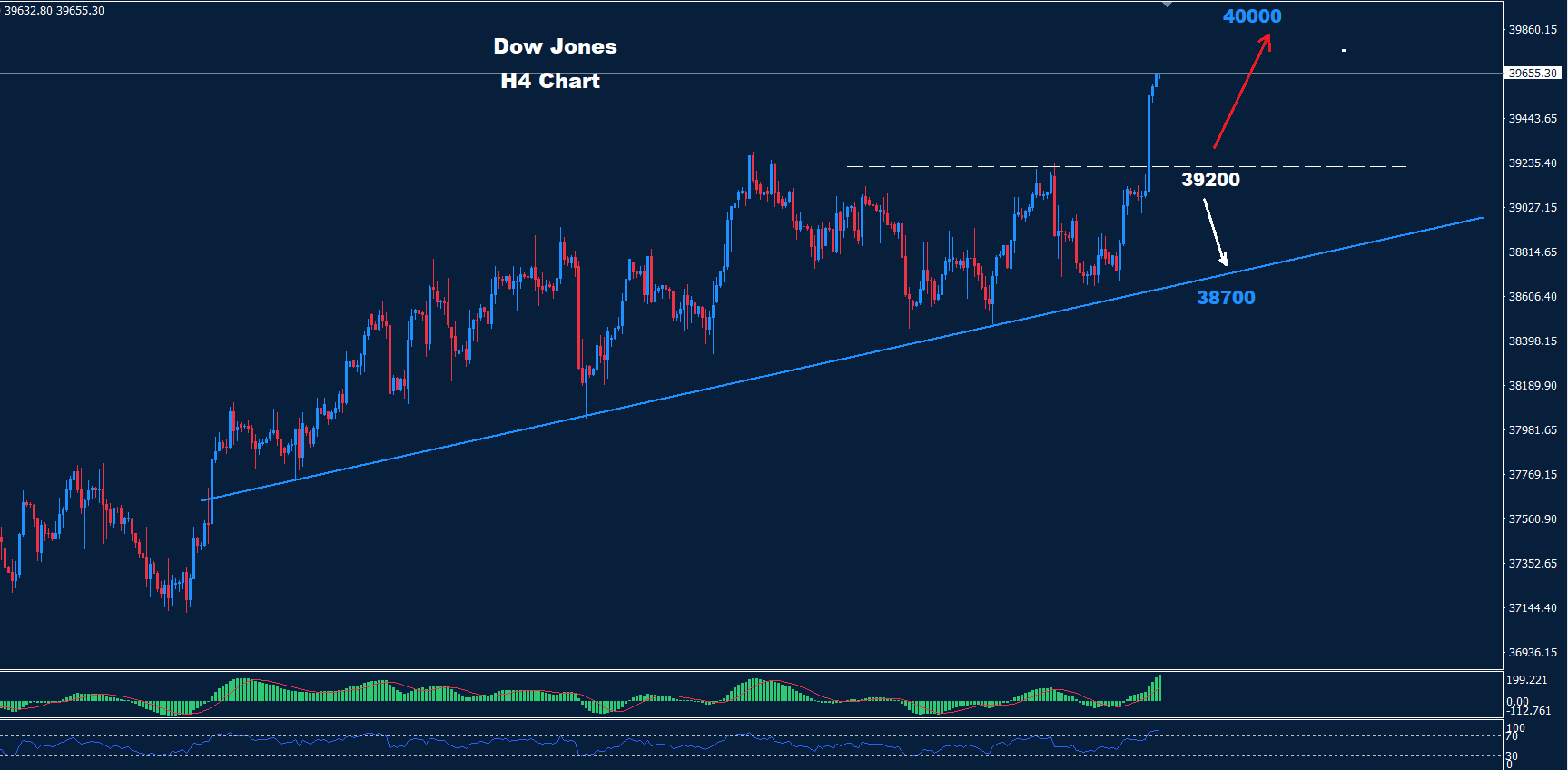 كما نرى على الرسم البياني، طالما استمر السوق في الاحتفاظ بالتداولات فوق 39200، فقد تستمر الموجة المتقدمة نحو 40000 وما فوق