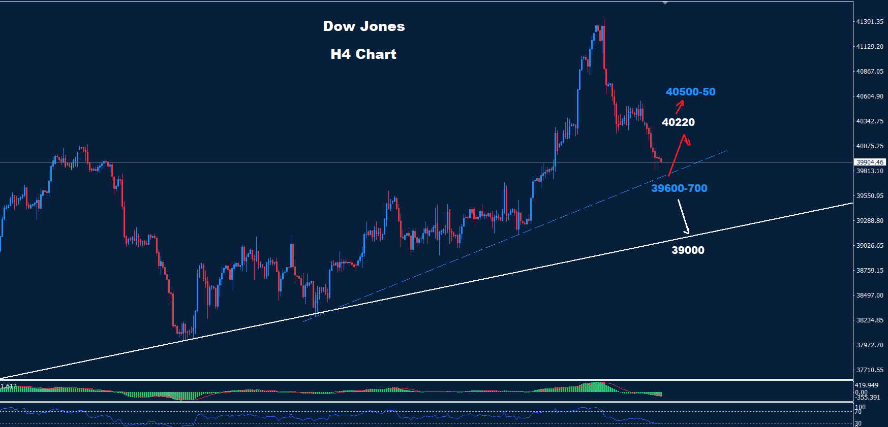تمكن مؤشر داو جونز من الهبوط إلى ما دون مستوى الدعم 40000 والذي قد يكون أول إنذار لموجة هبوط أخرى