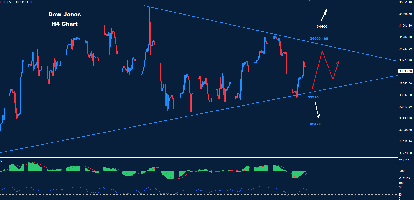 كما نصحنا في وقت مبكر من هذا الأسبوع ، يبدو أن مؤشر الداو يتجه إلى بناء تشكيل مثلث تداولي والذي قد يتحكم في منطقة التداول القادمة