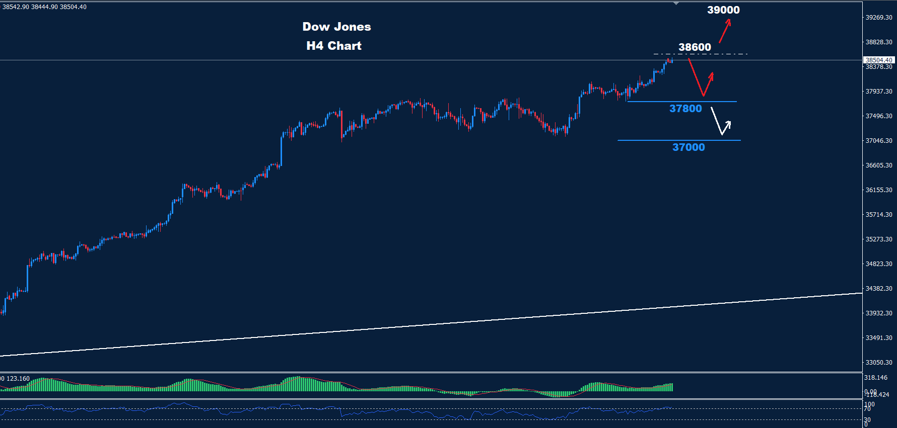 كما نرى على الرسم البياني للمدى اليومي، سيحظى السوق بدعم عند مستوى 37800 بينما توجد مقاومة عند مستوى 38600 مع وجود فرصة لمنطقة تداول بينهما.