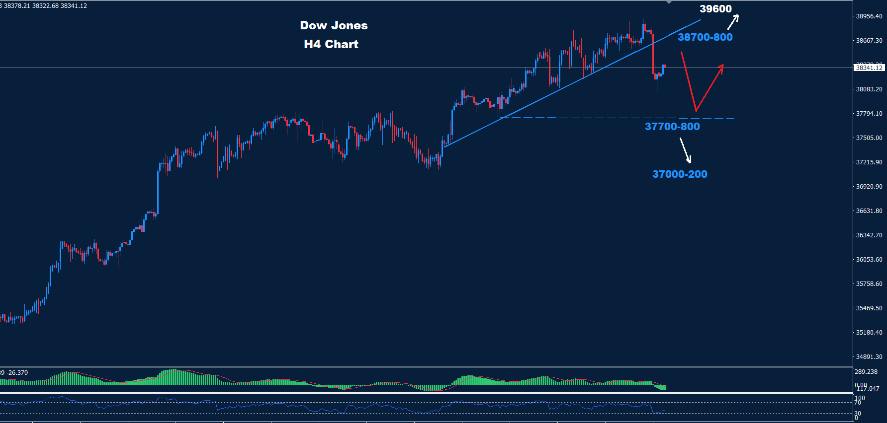 تمكن مؤشر داو جونز من اختراق مستوى الدعم 38500 بعد بيانات التضخم الأمريكية.
