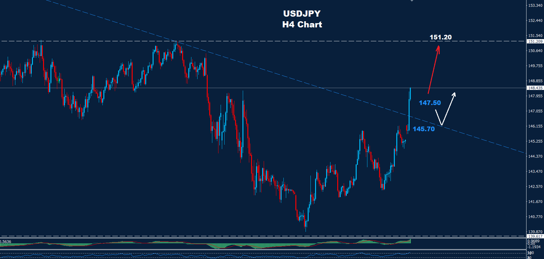 طالما حافظ السوق على تداولاته فوق أحد هذين الدعمين، فقد يستمر الارتفاع نحو منطقة المقاومة عند 151.20.