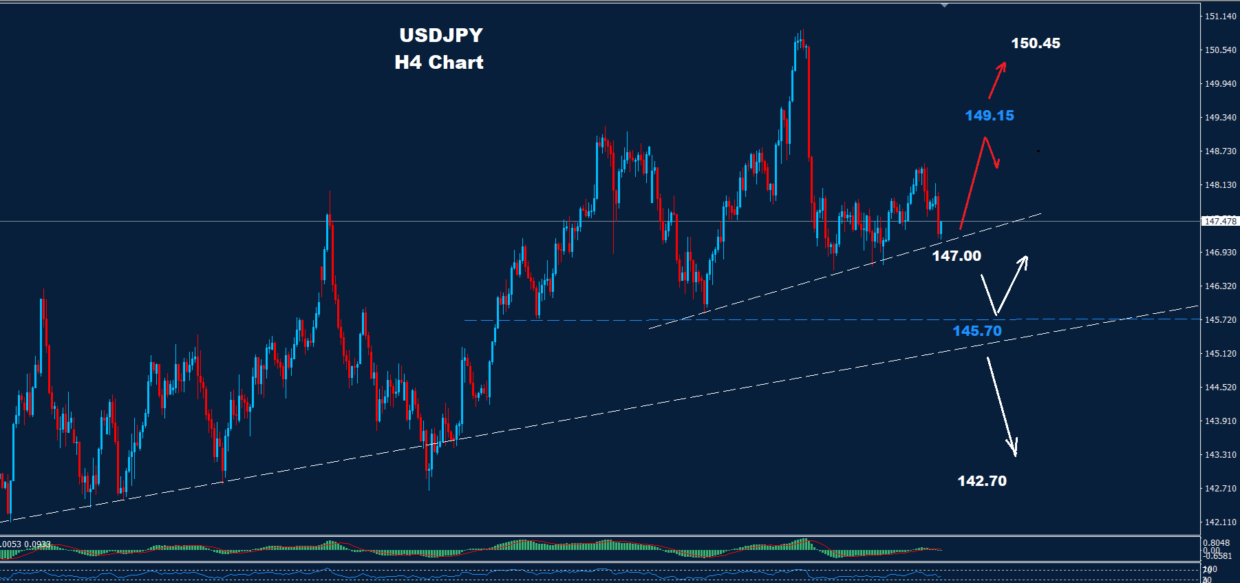 ووفقًا للرسم البياني، يُعد مستوى 147.00 أول دعم رئيسي للسوق، وبقاء السعر فوق هذا المستوى يفتح الباب لاستمرار الارتفاع نحو الهدفين المذكورين.