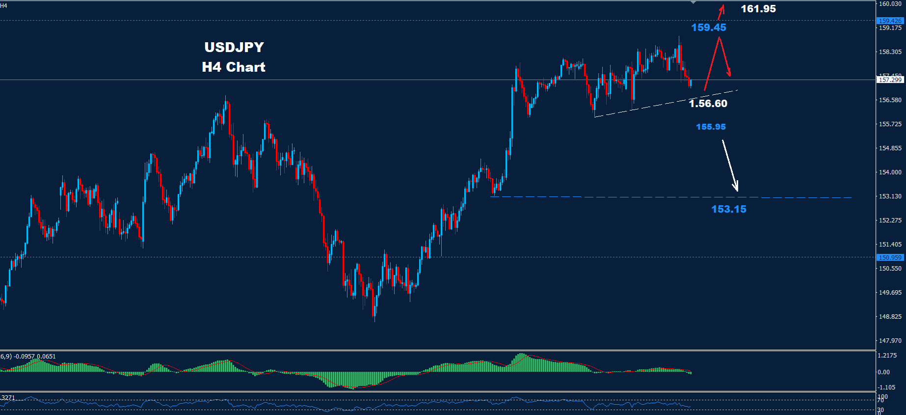 كما نرى على الرسم البياني، تظهر مستويات التداول اليومي ترند دعم حول 156.60، وطالما أن السوق يستمر في الاحتفاظ بالتداولات فوق منطقة 155.95، فقد تستمر حركة التقدم نحو الهدف الثاني 159.45 والذي بدوره قد ينشط موجة هبوط أخرى