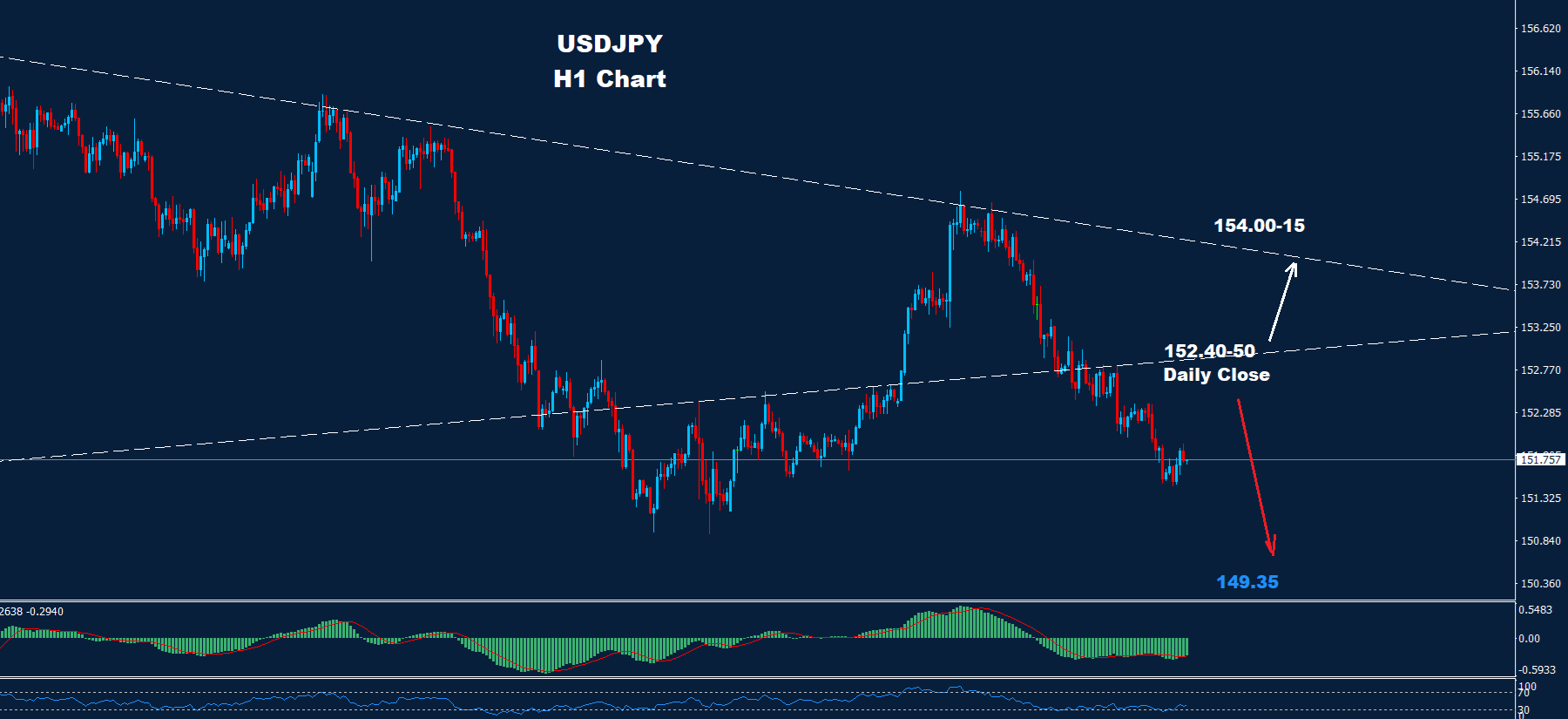 كما نرى على الرسم البياني وطالما أن السوق تحافظ على إغلاق يومي دون مستوى 152.40 فإن الضغط الهبوطي قد يستمر لمزيد من الهبوط نحو مستوى 149.35