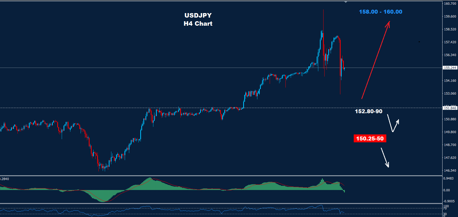 كما نرى على الرسم البياني، لا يزال السوق يواجه منطقة دعم المدى القصير 90-152.80 حيث طالما استمر السوق في الاحتفاظ بالتداولات فوقها، فقد تستمر الموجة المتقدمة مع فرص لارتداد جديد نحو 158.00-160.00