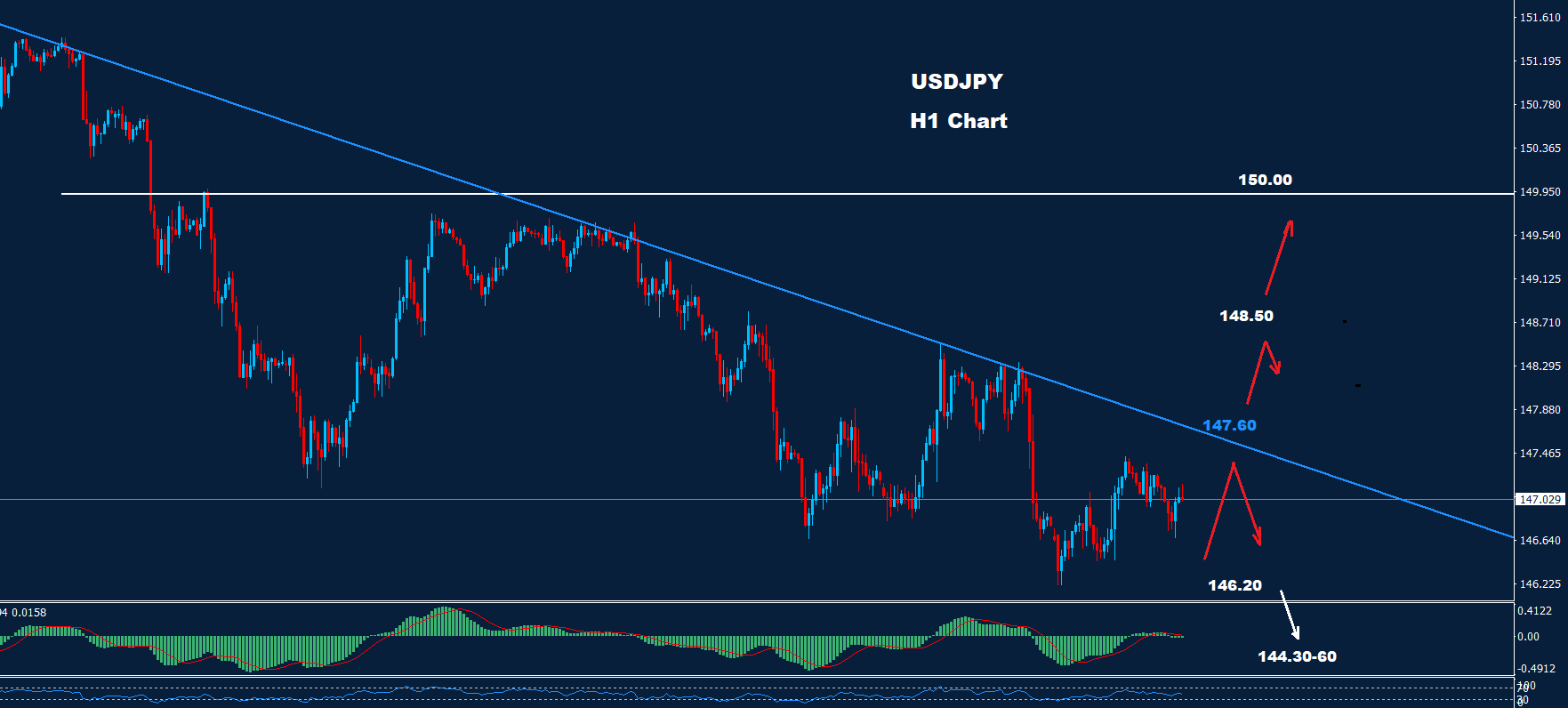 كما نرى على الرسم البياني، يواجه السوق مقاومة للترند الهابط حول 147.60 بينما يقع الدعم حول 146.20.