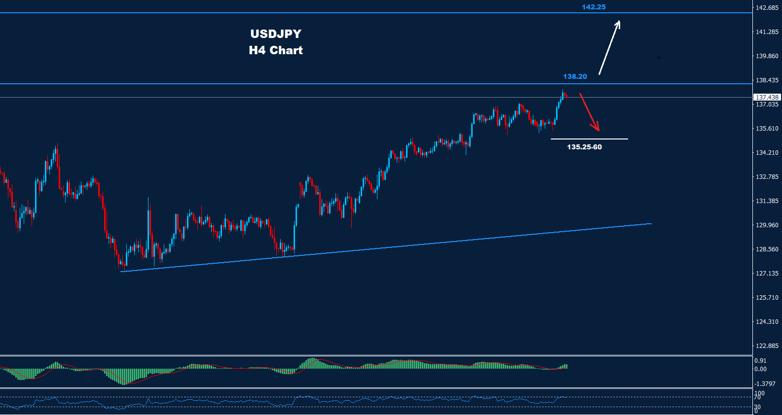 كما نرى على الرسم البياني، يواجه السوق مقاومة حول 138.15 حيث طالما أن السوق يتداول تحت هذا المستوى، فقد يضرب تصحيح هبوطي السوق حيث يتواجد الدعم عند 137.00 و60-135.25.