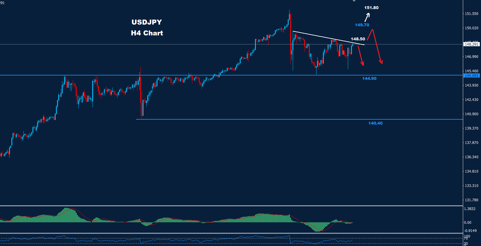 تمكن الدولار الأميركي مقابل الين الياباني من إبقاء التداولات تحت المقاومة 148.50 حيث تمكن من التوجه لحركة هبوط أخرى والاقتراب من الهدف الأول 146.00.