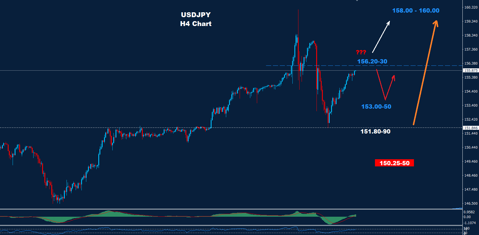 كما نصحنا الأسبوع الماضي، لا تزال موجة التقدم مستمرة حيث تمكن دعم المدى القصير 151.80 من دفع السوق نحو التقدم مرة أخرى حيث لا يزال الهدف نحو المنطقة 158.00-160.00