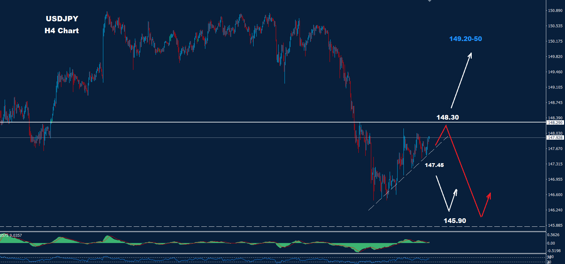 تحت 147.45 قد يكون من المتوقع المزيد من الانخفاض حيث يقع الدعم عند 145.90.