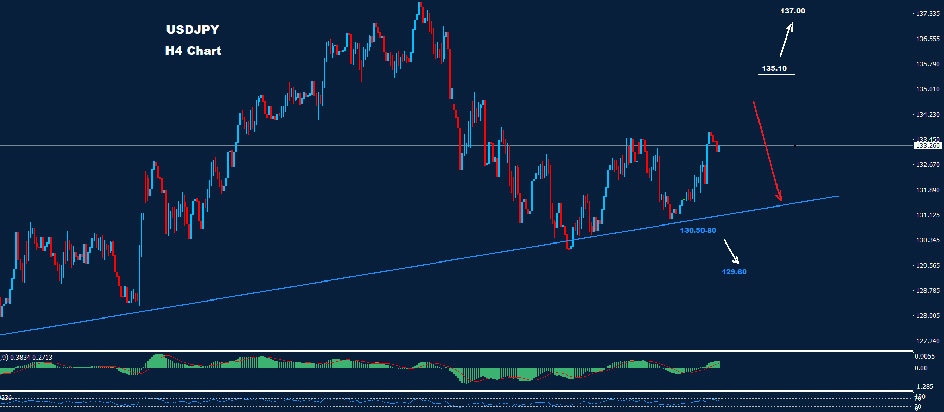 تمكن السوق من تحقيق تقدم فوق المقاومة الأولى 133.80 الأسبوع الماضي وفي بدايات هذا اليوم بينما لا تزال المقاومة الثانية حول 135.10