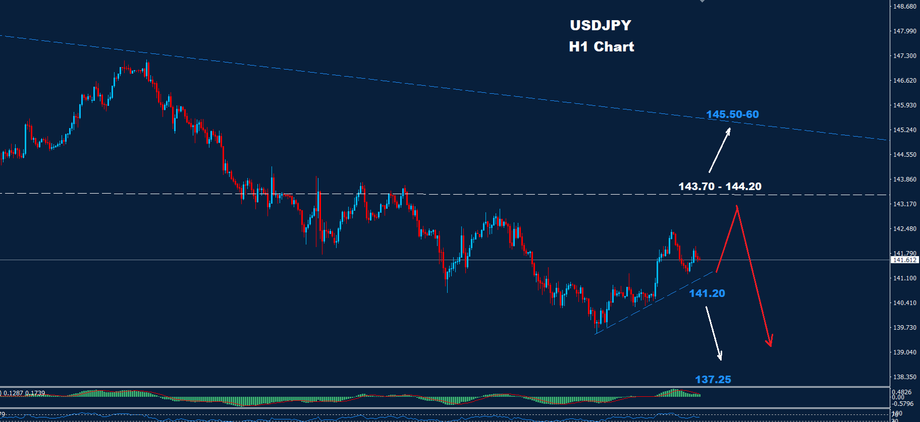 كما نرى على الرسم البياني للمدى اليومي، يواجه السوق دعمًا حول مستوى 141.20، حيث استمر السوق في الاحتفاظ بالتداولات فوق هذه المنطقة فان مزيد من الارتفاع نحو مناطق 143.70-144.20 قد يضرب السوق والذي قد يؤدي بدوره إلى إعادة تنشيط موجة الاتجاه الهبوطي نحو مستوى 137.25