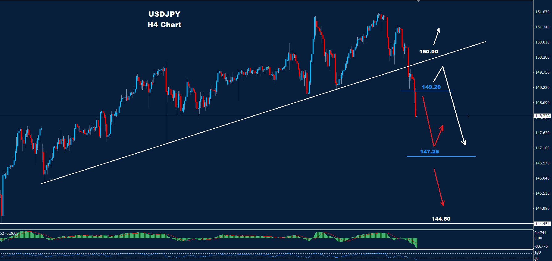 تمكن الدولار الأميركي مقابل الين الياباني من الانخفاض إلى ما دون مستوى الدعم 149.70، مما قد يدفع لمزيد من الانخفاض نحو 147.25 وأدناه كما نصحنا الأسبوع الماضي.