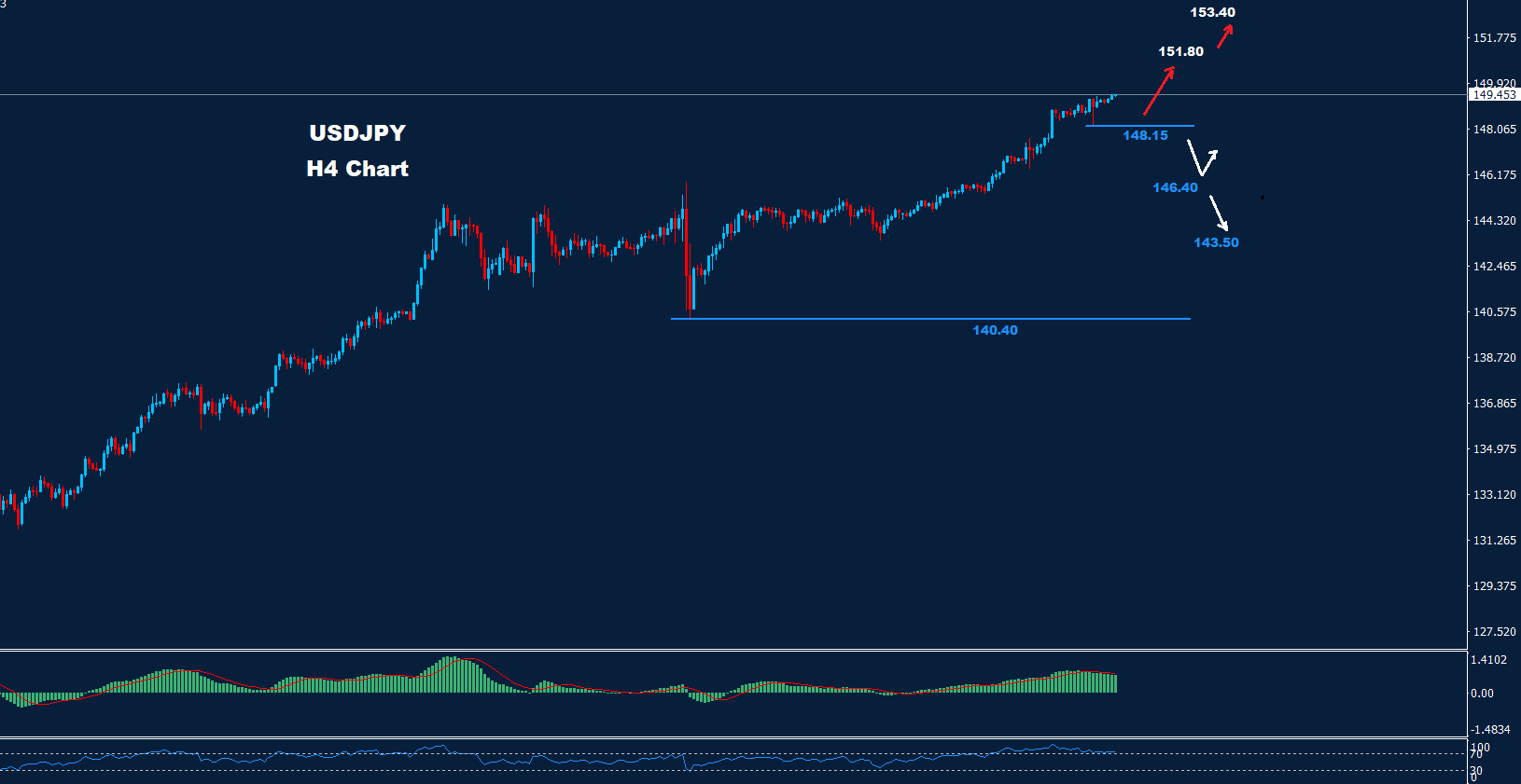 تمكن الدولار الأميركي مقابل الين الياباني من الوصول إلى ما فوق 149.30 حيث نصحنا في وقت مبكر من هذا الأسبوع بأن المزيد من التقدم فوق هذا المستوى قد يضرب السوق.