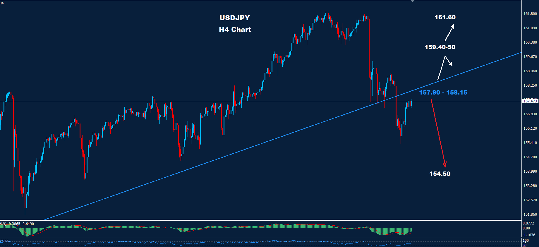 من المتوقع حدوث المزيد من التقدم فوق مستوى 158.15 حيث توجد المقاومة الثانية حول مستوى 50-159.40 مما قد يدفع السوق إلى بعض التصحيح الهبوطي