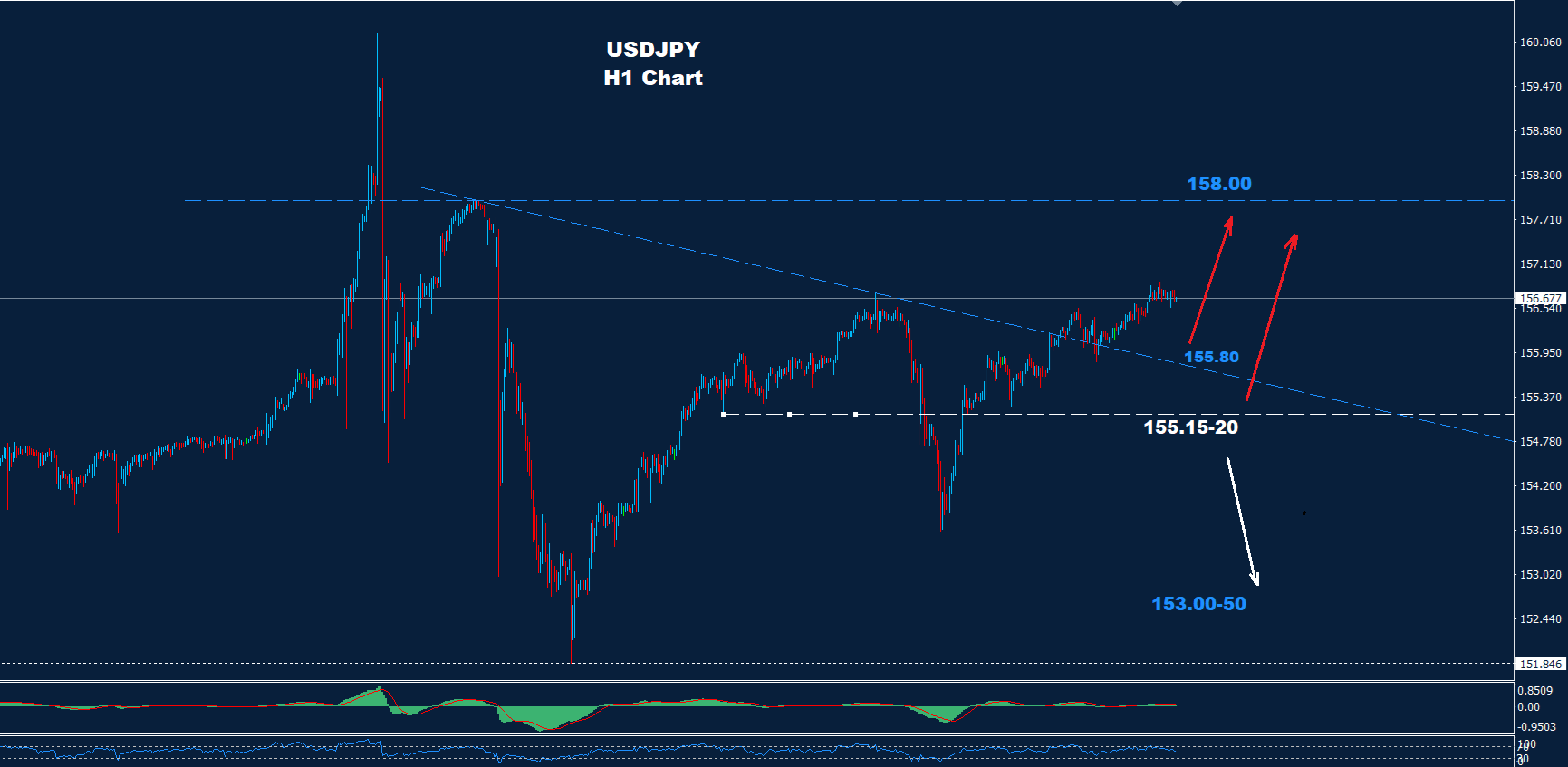 تمكن الدولار الأميركي مقابل الين الياباني من تجاوز المقاومة 50-156.30 مما قد ينشط موجة تقدم أخرى نحو الهدف 158.00 كما نصحنا من قبل