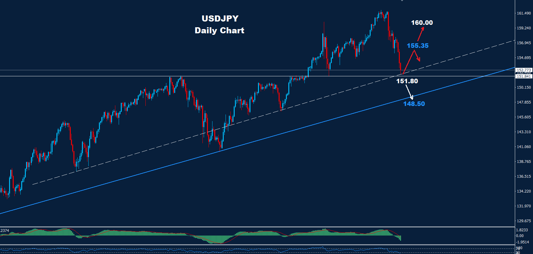 تمكن زوج الدولار/ين من الحفاظ على التداولات فوق مستوى الدعم 151.80 حيث تمكن حتى الآن من الارتداد نحو مستوى 154.70