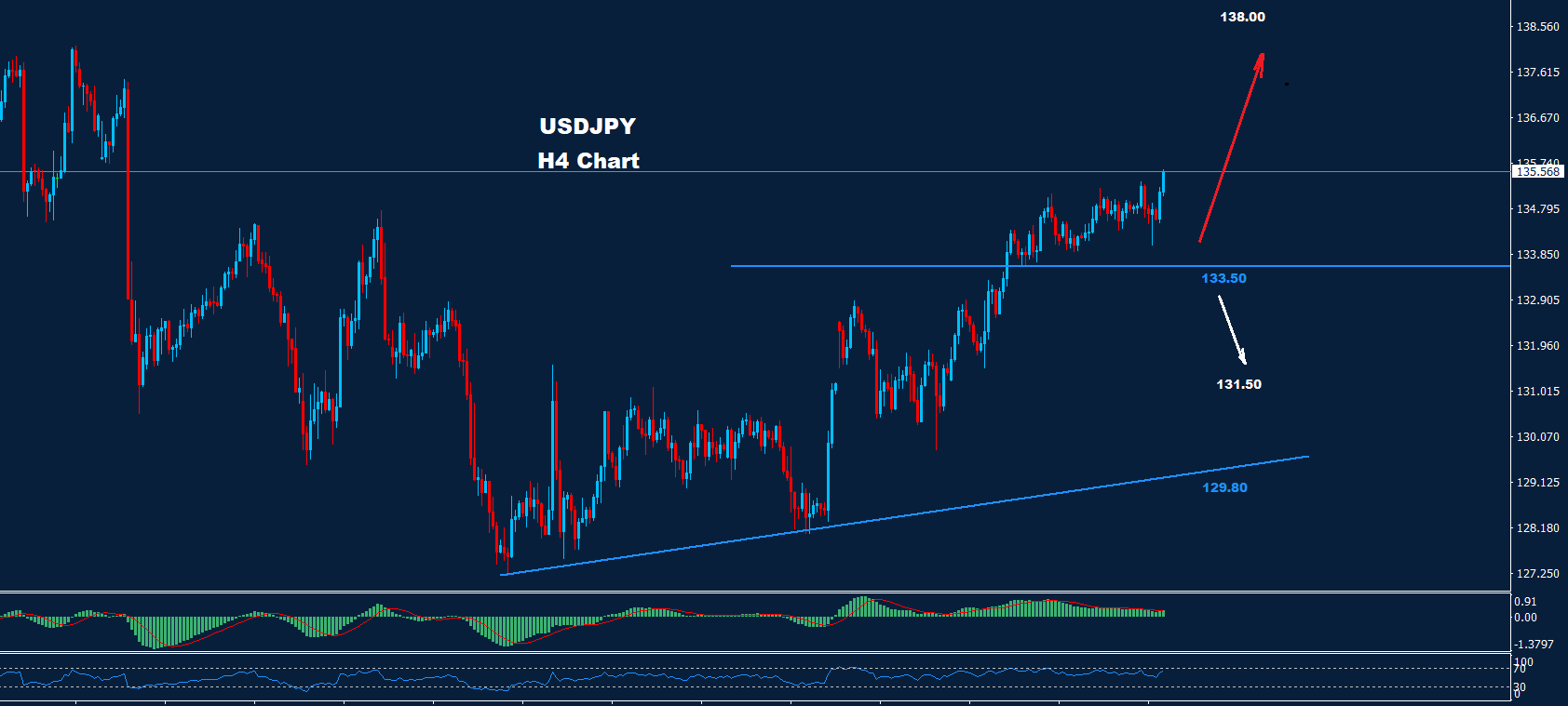 تمكن الدولار الأميركي مقابل الين الياباني من التقدم فوق المقاومة 134.75 عدة مرات، مما قد يكون إشارة إلى تقدم أبعد قادم.