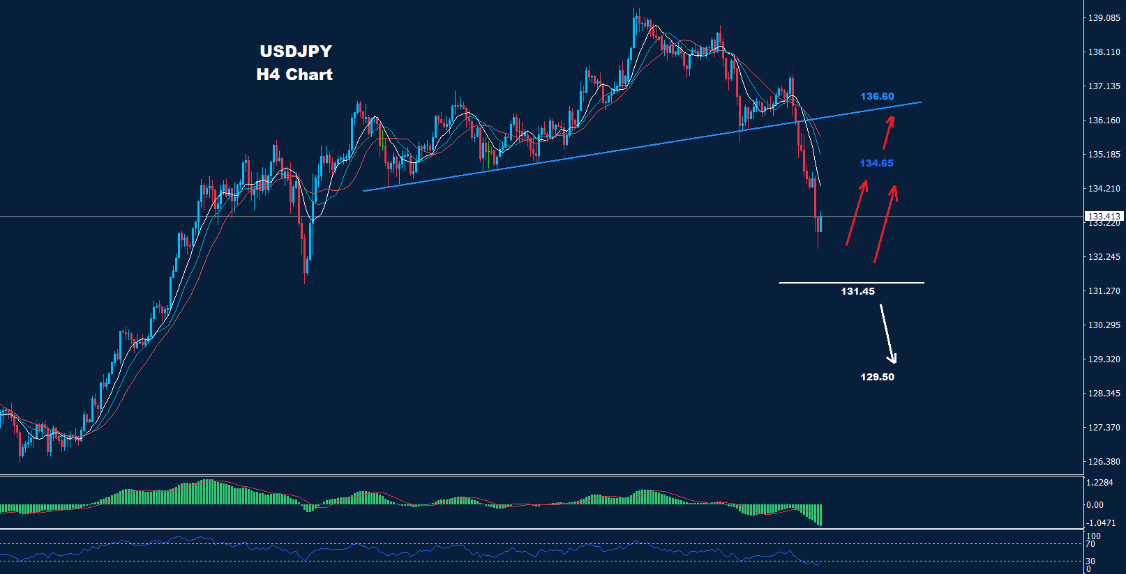 كما نرى على الرسم البياني، يواجه السوق مستويات دعم حول 131.45 حيث طالما استمر السوق في الاحتفاظ بالتداولات فوق هذا الدعم، فمن المتوقع حدوث موجة تصحيح ارتدادية نحو 134.65 و 136.60.