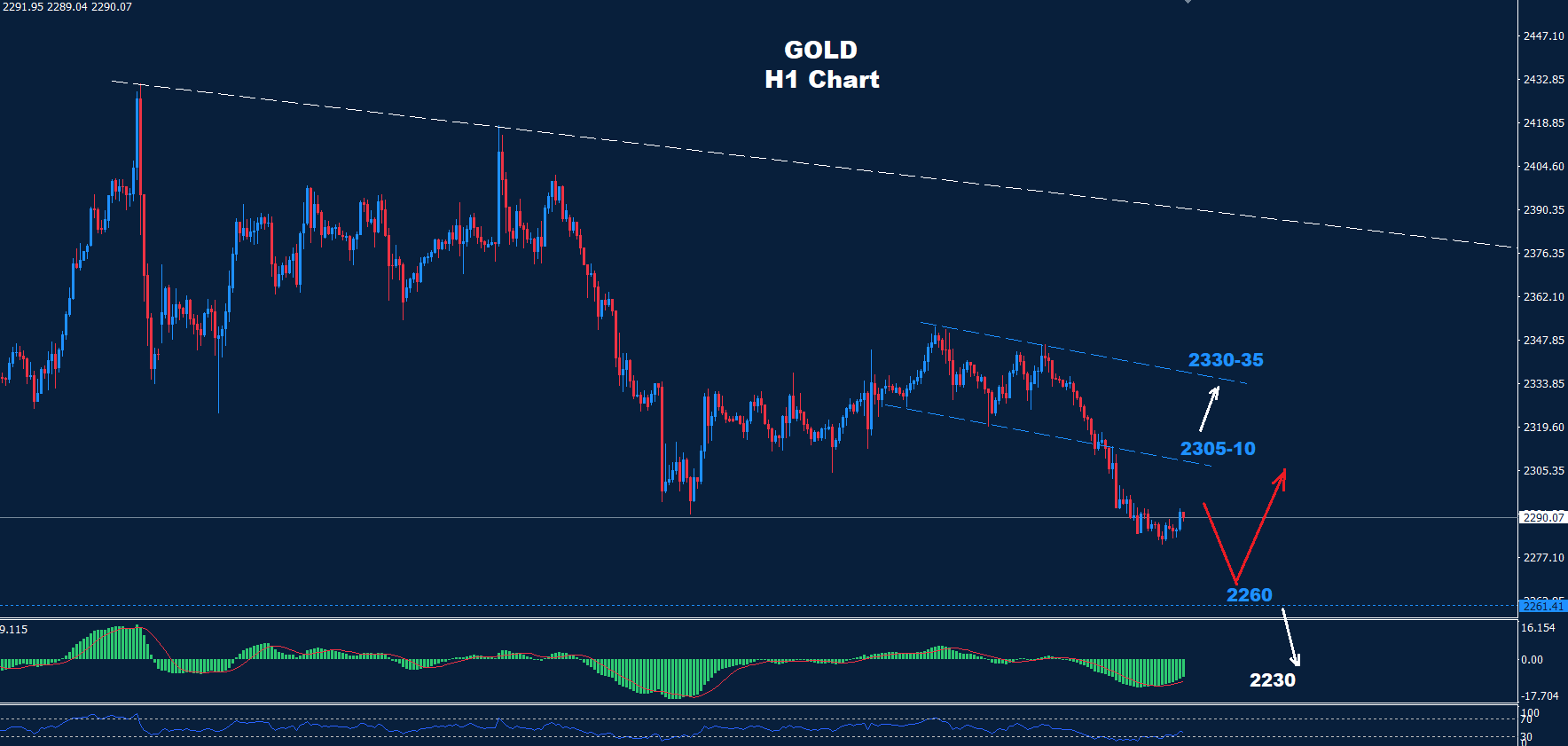 كما نرى على الرسم البياني، يواجه السوق مقاومة خلال اليوم حول منطقة 10-2305 حيث طالما استمر السوق في الاحتفاظ بالتداولات تحت هذه المنطقة، فقد يكون من المتوقع حدوث حركة هبوطية أخرى لاختبار دعم 2260 قبل أن يتجه السوق لموجة تقدم أخرى.