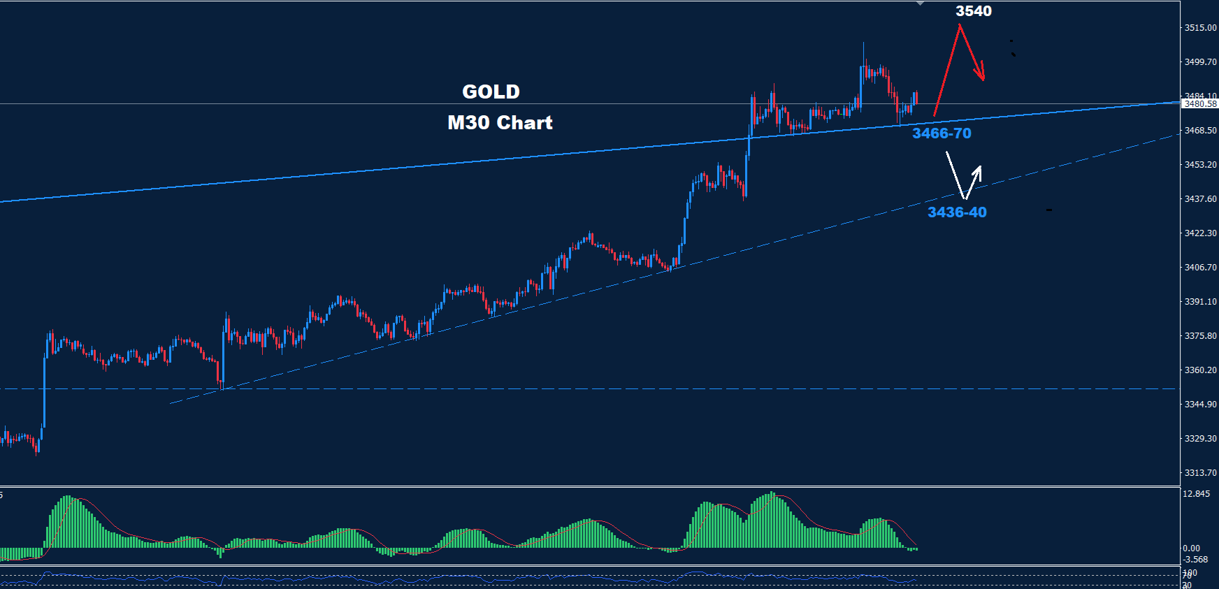 لا تزال موجة الصعود مستمرة، حيث قد يُبقي دعم التراند حول 70-3466 موجة الصعود مستمرة نحو الهدف الثاني 3540، والذي بدوره قد يدفع السعر إلى بعض التصحيح الهبوطي.