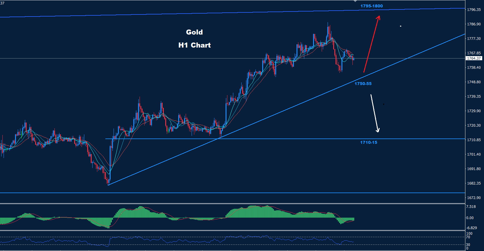 وطالما استمر السوق في الاحتفاظ بالتداولات فوق منطقة الدعم هذه، فقد تستمر الموجة المتقدمة نحو الهدف 1795-1800.