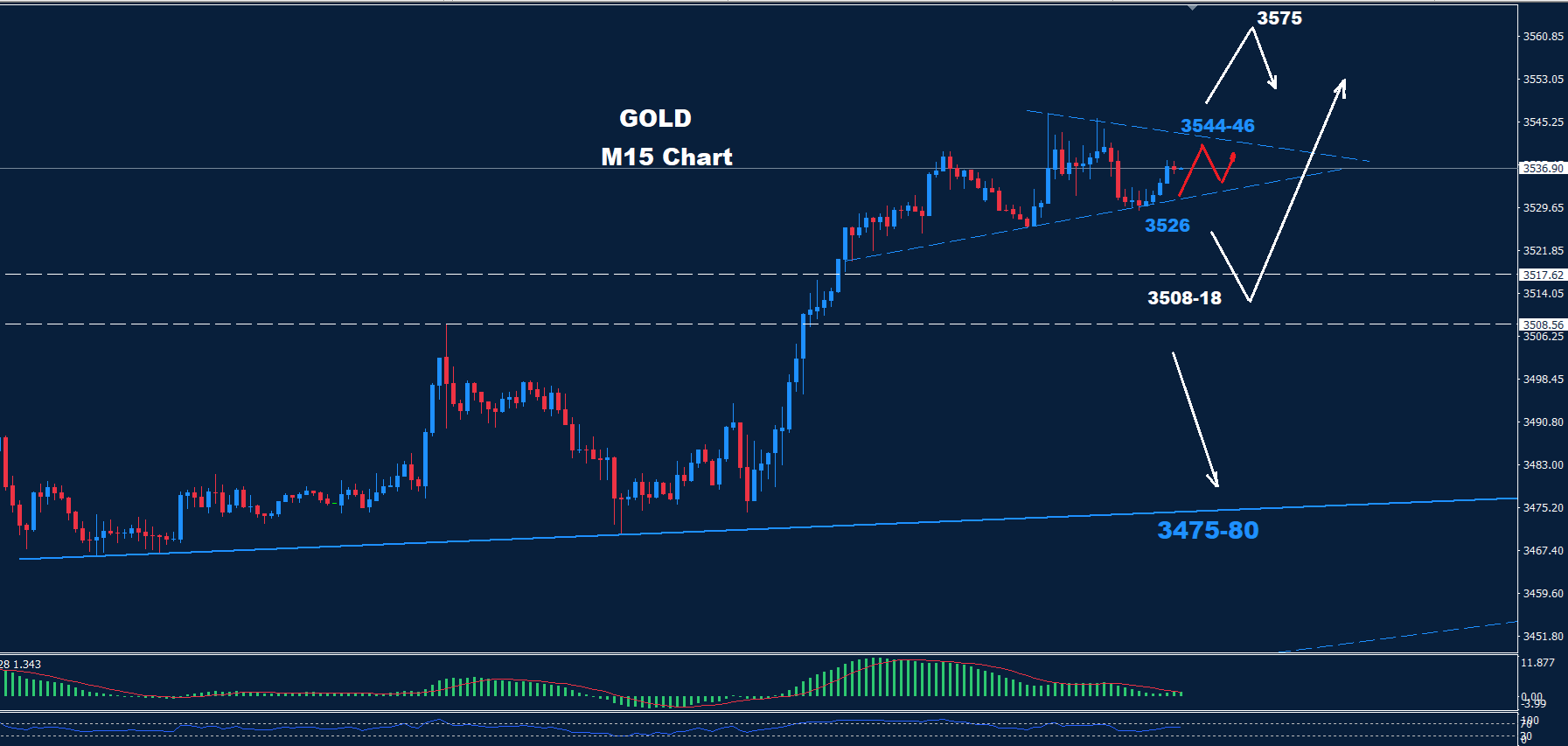 أما تحت مستوى 3526، فقد يتسع نطاق هذا التصحيح الهبوطي لمزيد من الانخفاض، بينما لا يزال مستوى الدعم 3508 يحمي السوق لمزيد من التقدم نحو 3575.