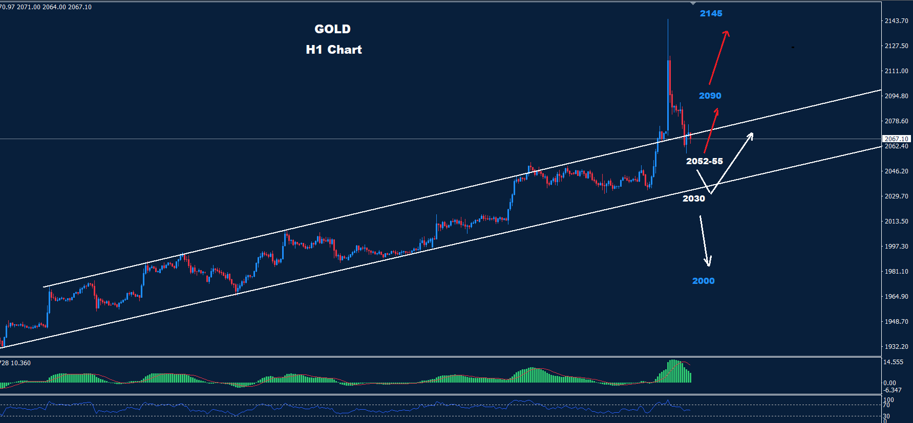 تمكن الذهب من تحقيق الهدف 2075 يوم الجمعة الماضي بينما تمكن السوق في وقت مبكر من الافتتاح اليوم من تحقيق اختراق لارتفاع سريع فوق 2075 حيث تمكن من الوصول إلى مستويات 2144 قبل تراجع السوق.