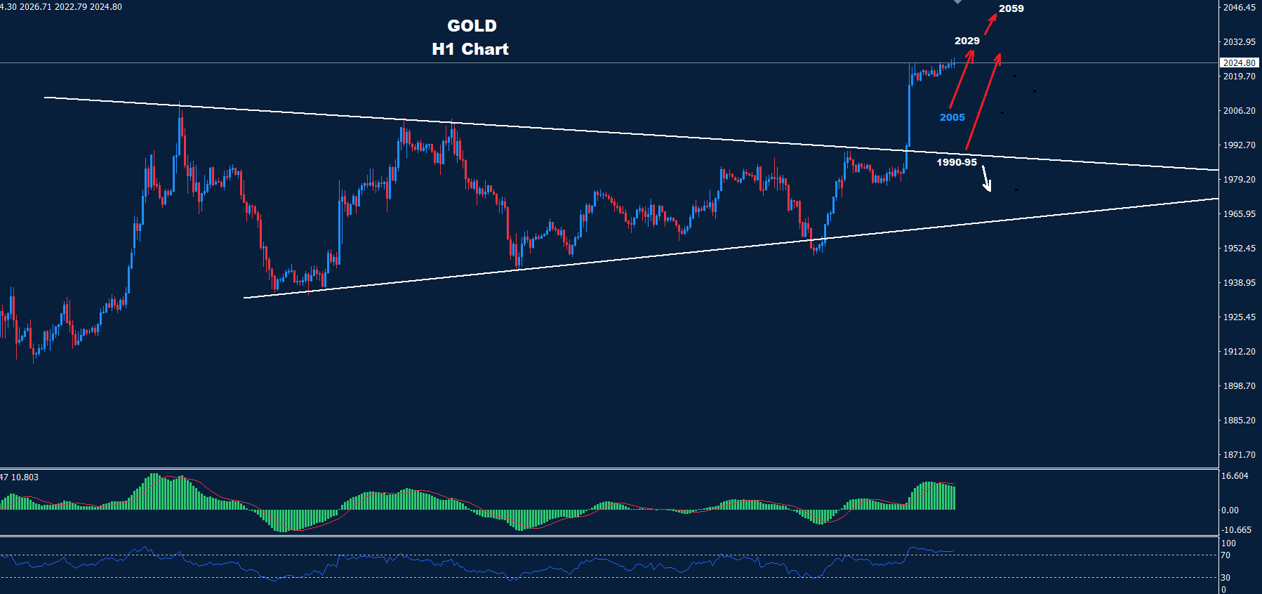 كما نرى على الرسم البياني، يواجه السوق الآن دعائم حول 2015 و2005 و1990 والتي قد تحافظ على مسار الصعود بالسوق نحو اهداف 2059.