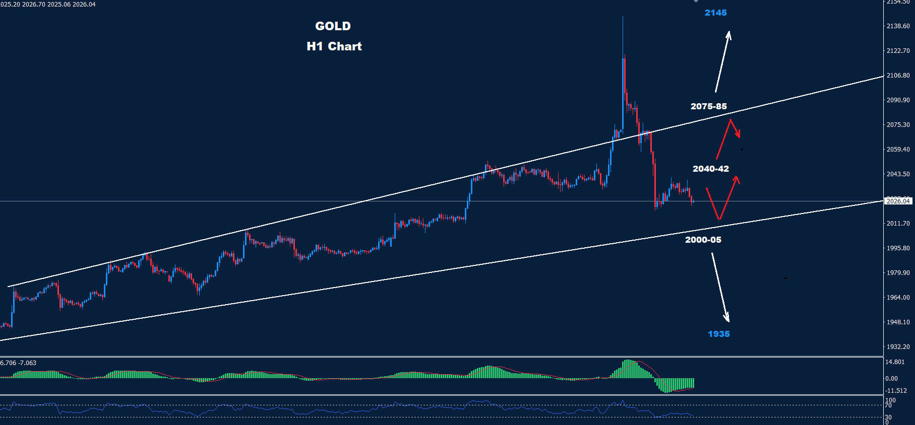 تمكن الذهب من الاحتفاظ بتداولاته تحت منطقة المقاومة 42-2040 حيث طالما أن السوق يتداول تحتها فإن حركة الهبوط قد تستمر لاختبار دعم الترند 05-2000 والذي بدوره قد يدفع إلى تصحيح ارتدادي.