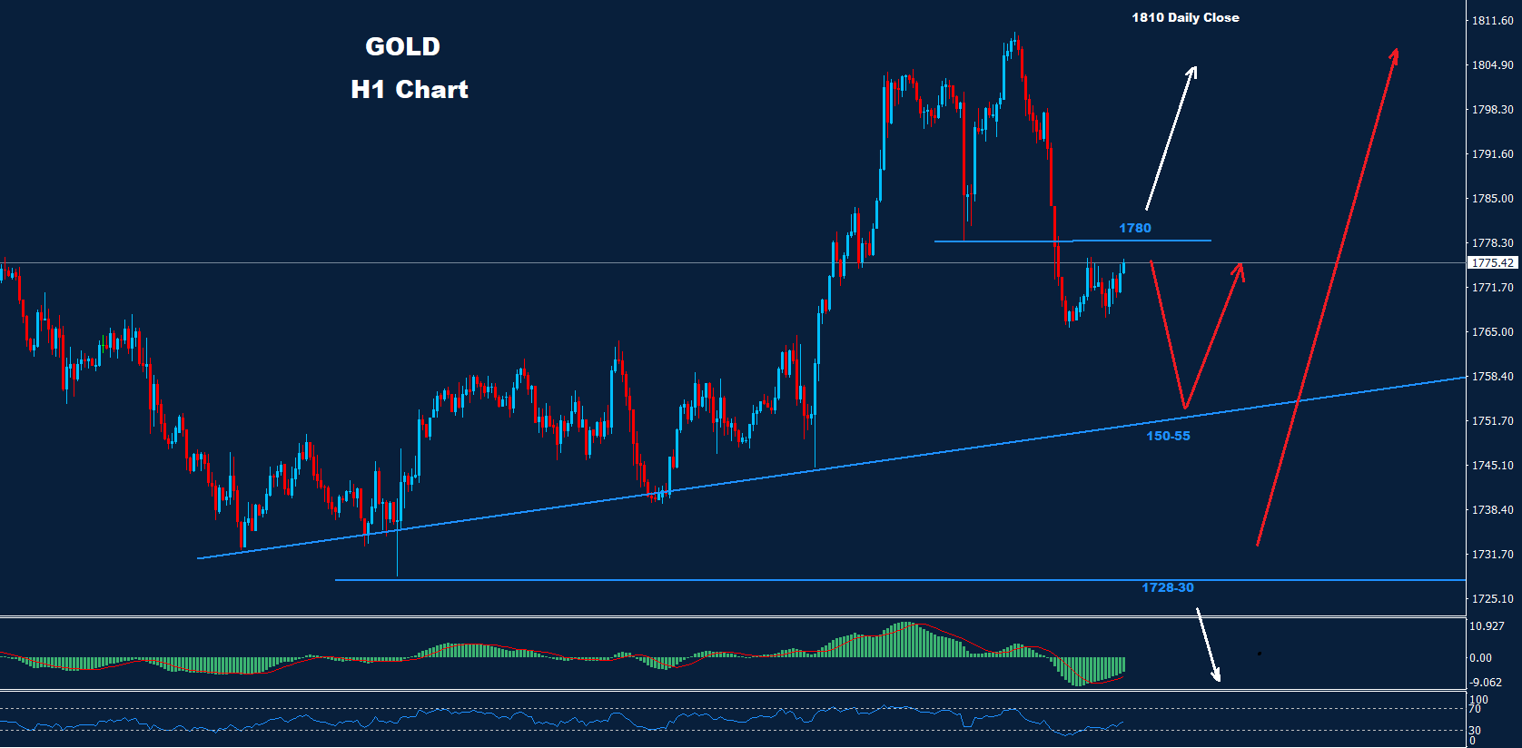 طالما استمر السوق في الاحتفاظ بالصفقات تحت 1780، فإن فرصة المزيد من الانخفاض نحو 55-1750 لا تزال قائمة.