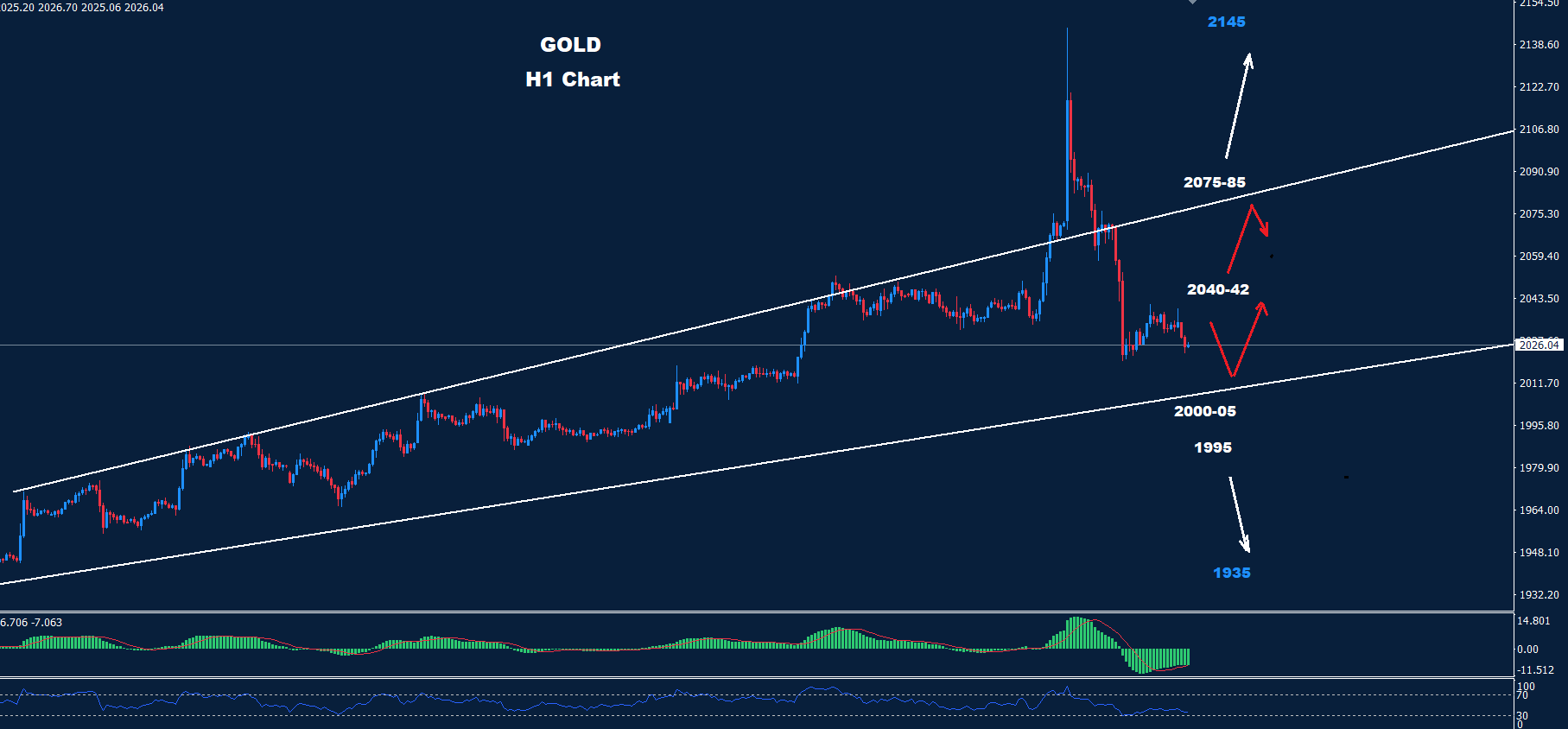 تمكن الذهب من الاحتفاظ بتداولاته تحت منطقة المقاومة 42-2040 حيث طالما أن السوق يتداول تحتها فإن حركة الهبوط قد تستمر لاختبار دعم الترند 05-2000 والذي بدوره قد يدفع إلى تصحيح ارتدادي صاعد.