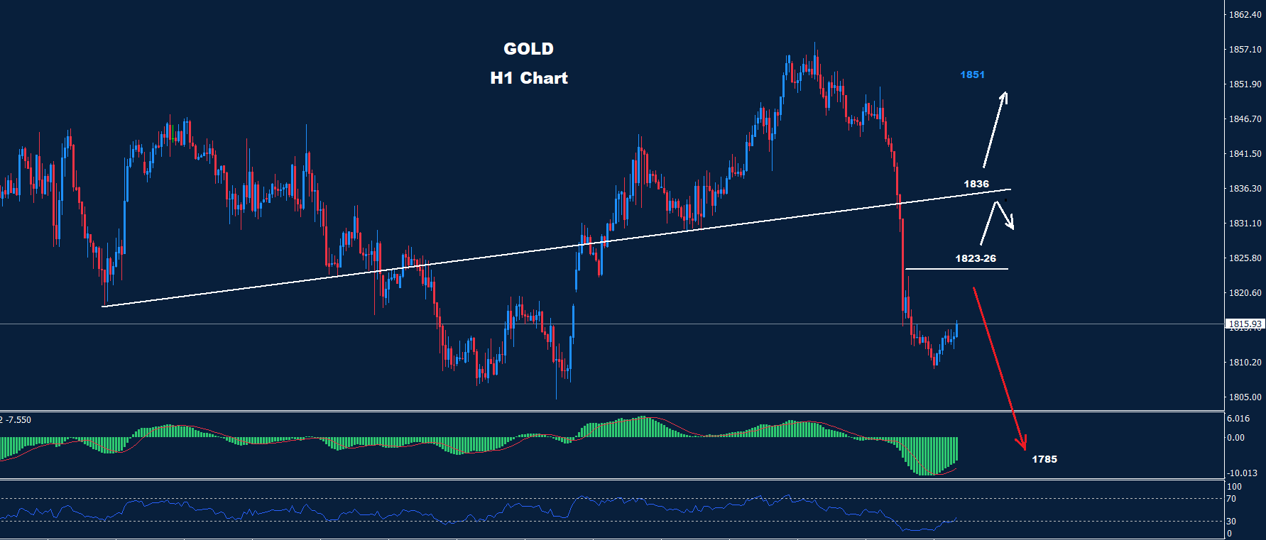 فوق 1826 فإن المزيد من التقدم قد يضرب السوق مع وجود مقاومة أخرى حول 38-1836 والتي بدورها قد تنشط حركة الهبوط.