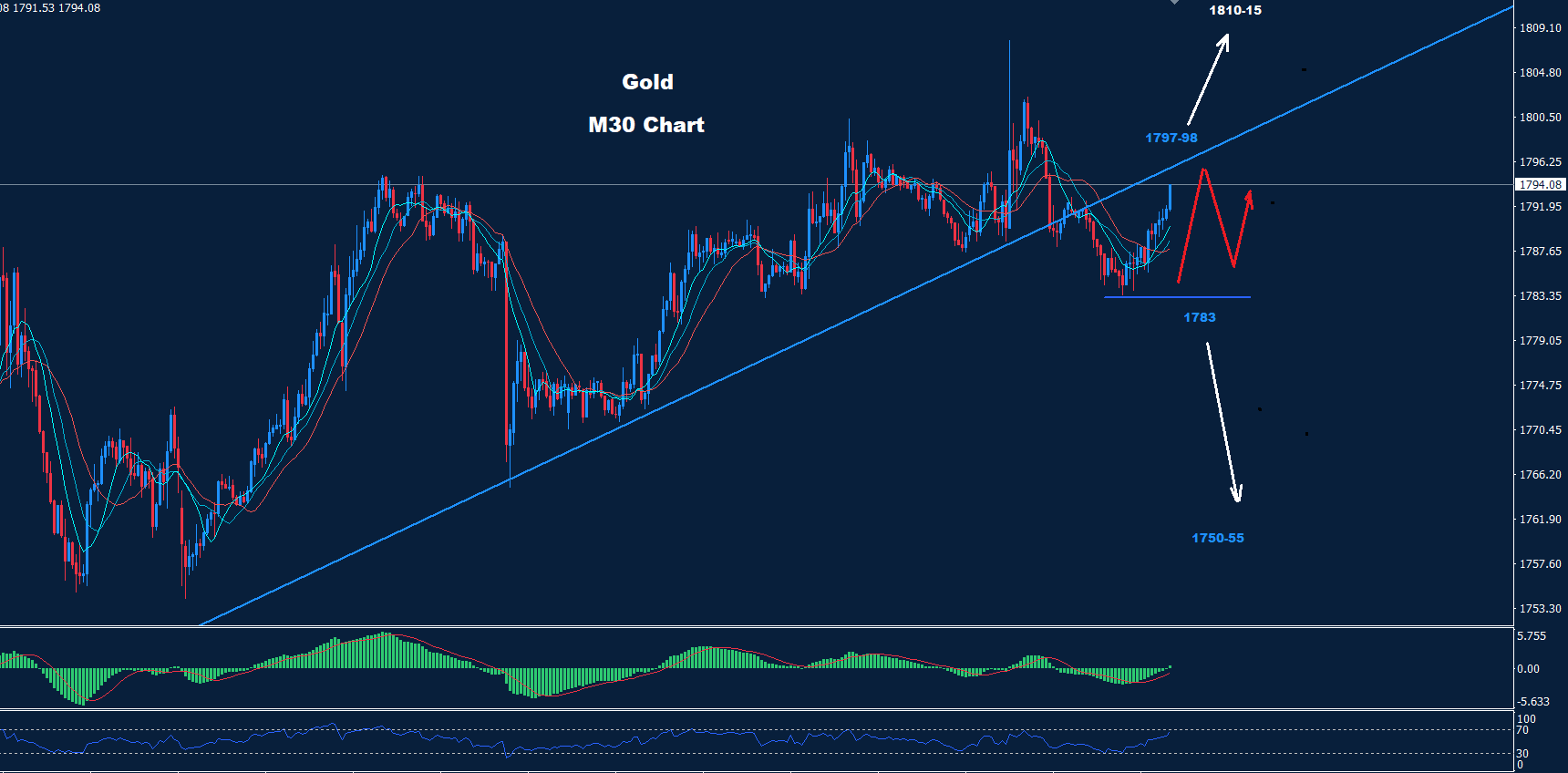 كما نرى على الرسم البياني اليومي، يواجه الذهب الدعم حول 1783 بينما المقاومة حول 98-1797 والتي قد تشكل منطقة تداول
