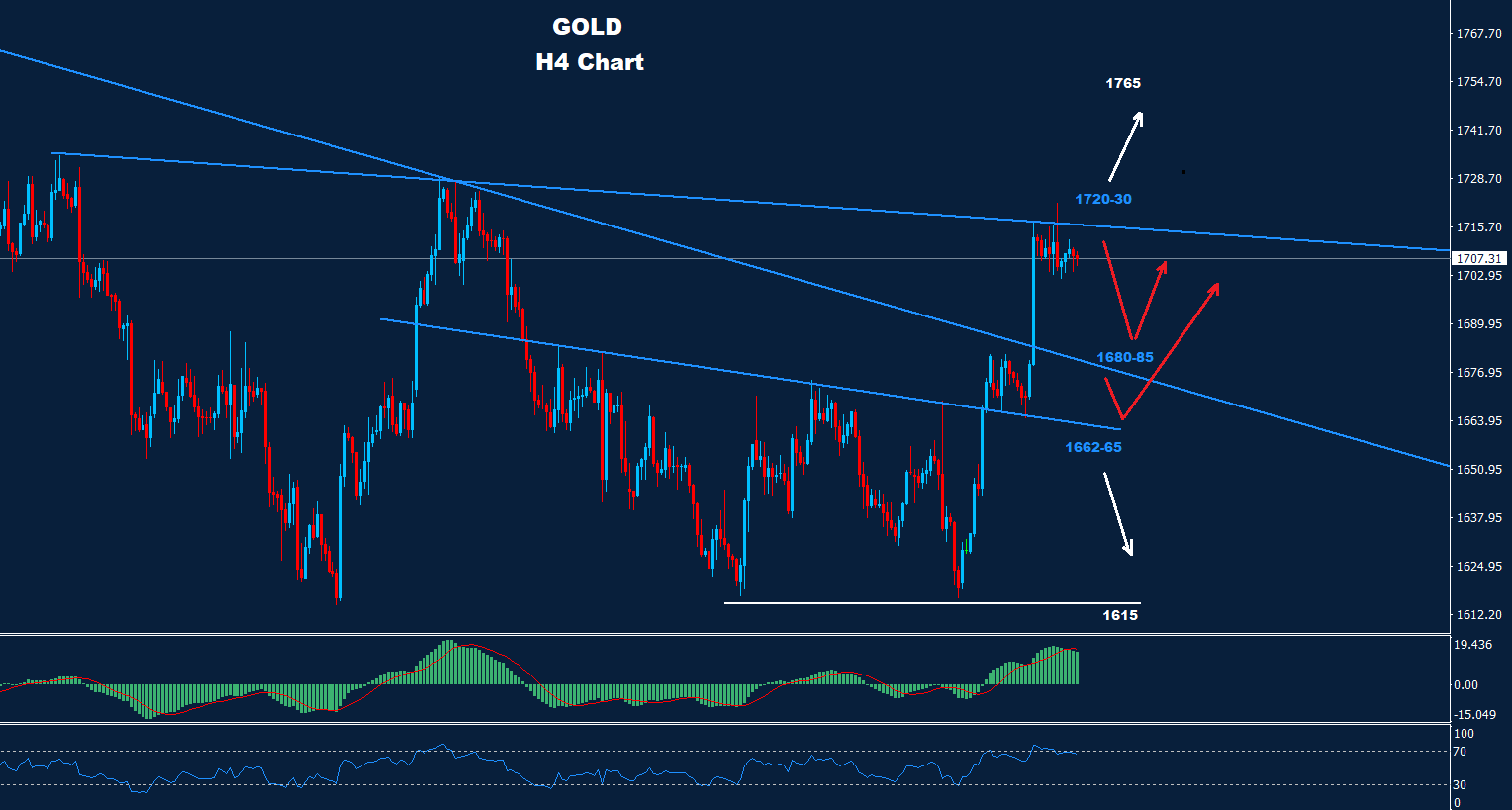 كما نصحنا في وقت مبكر من هذا الأسبوع ، تمكن الذهب من اختراق مستوى المقاومة 1685 حيث تمكن أمس من الوصول إلى المنطقة المستهدفة 30-1720