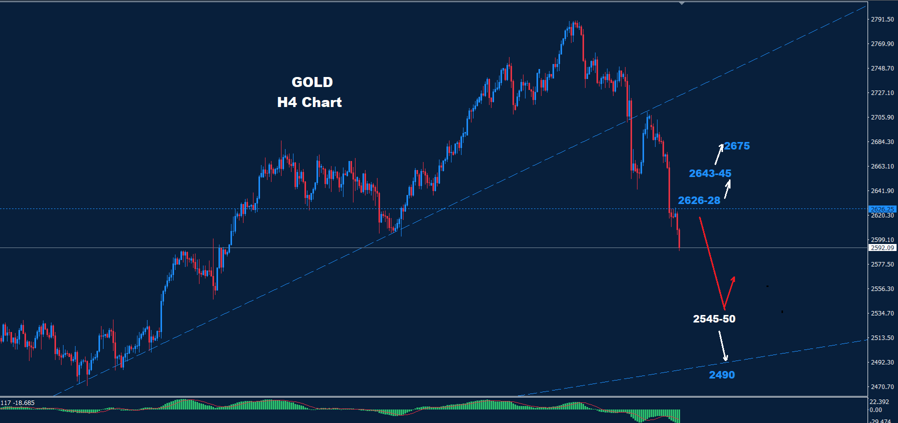 كما نرى على الرسم البياني، يواجه السوق أول مقاومة عند 28-2626، طالما أن السوق يستمر في الاحتفاظ بالتداولات تحتها، فقد يستمر نمط الهبوط على الذهب لمزيد من الهبوط نحو منطقة 50-2545