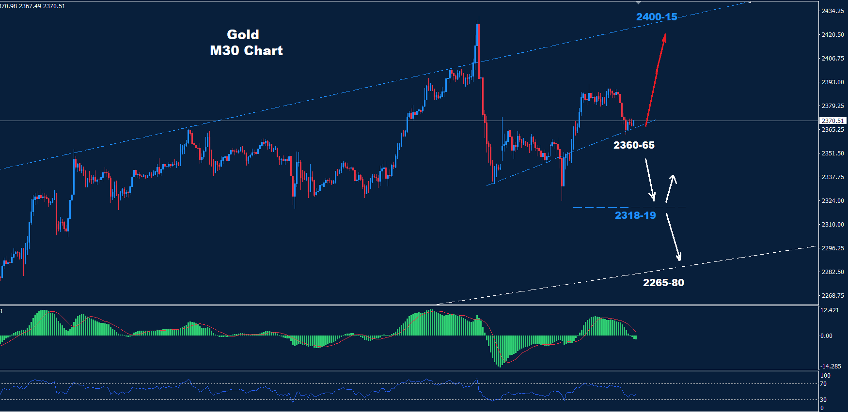 يختبر الذهب منطقة الدعم الاولى للمدى اليومي حول 65-2360 والتي إذا تمكنت من دعم السوق فمن المتوقع تقدم آخر نحو 2400