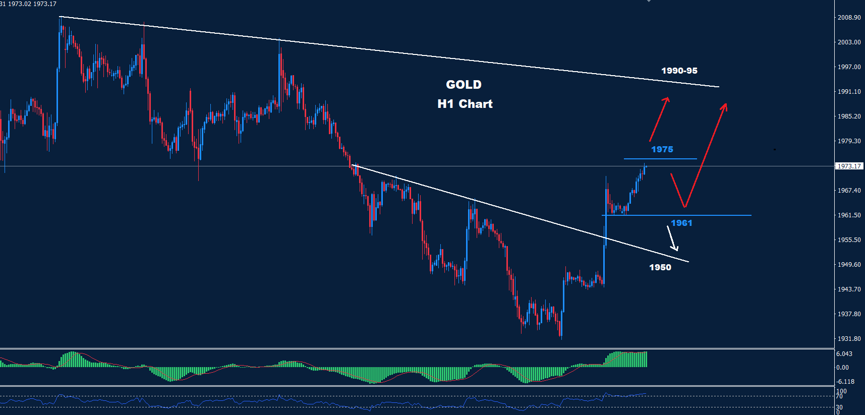 تمكن الذهب من الاحتفاظ بتداولاته تحت مستوى المقاومة 1975 حيث تمكن من ضرب تصحيح هبوطي نحو مستويات 1961 وما دونه.