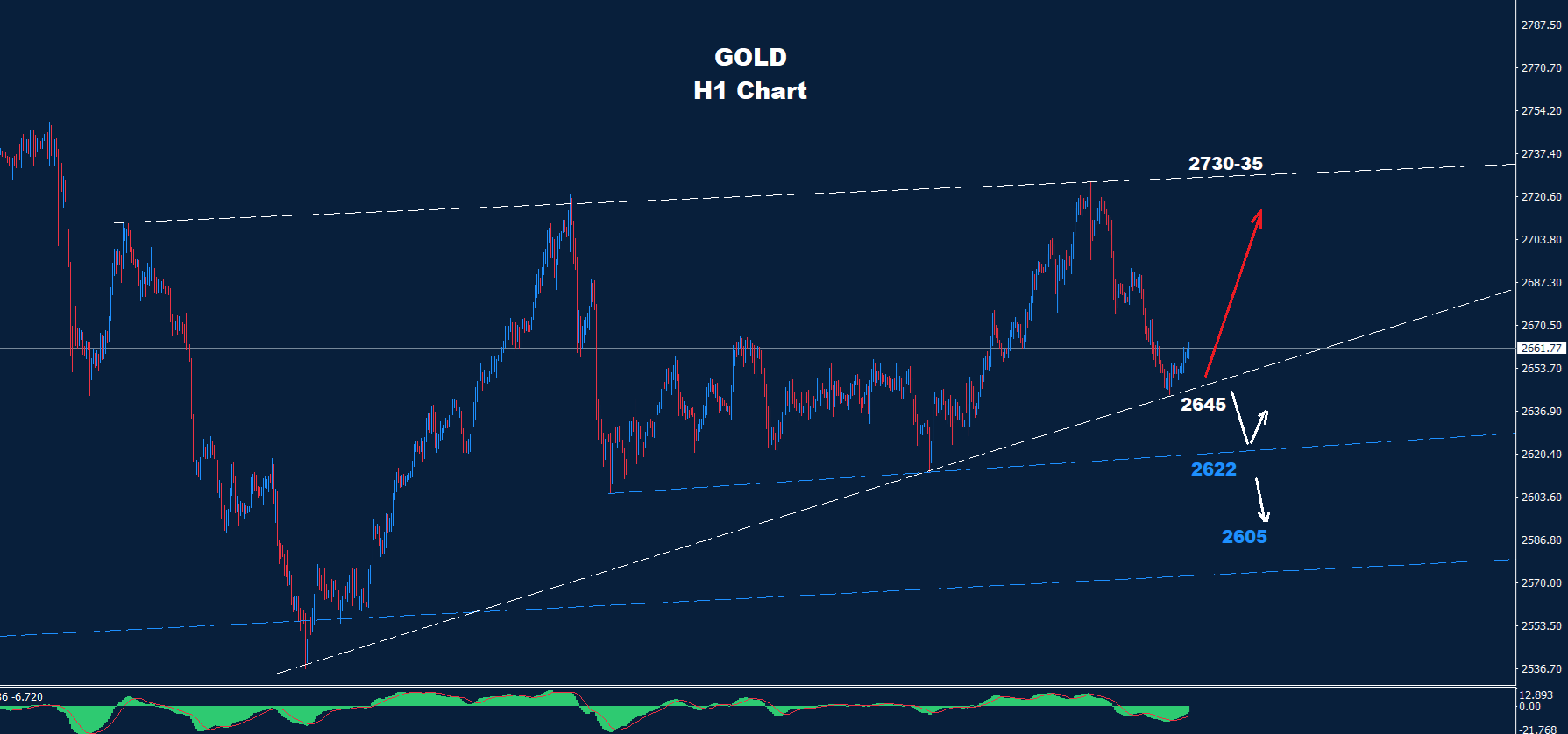 الانخفاض إلى ما دون مستوى 2645 قد يؤدي إلى هبوط آخر نحو مستوى 22-2620، مما قد يؤدي بدوره إلى تنشيط حركة تصحيح ارتدادي أخرى