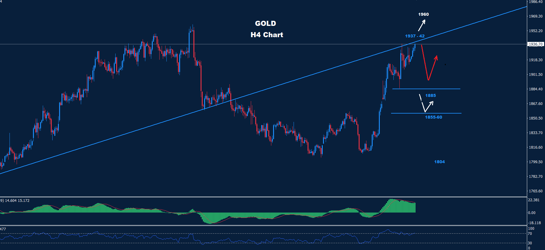تمكن الذهب من اختراق المقاومة لمستويات 1925، حيث تمكن من التقدم أكثر نحو مناطق 1937 حتى الآن.