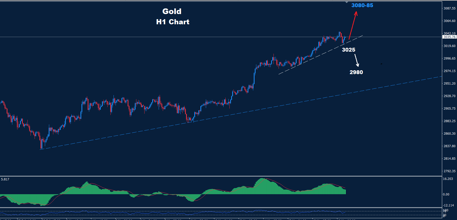 كما نرى على الرسم البياني، يواجه السوق دعمًا حول 3025، مما قد يُبقي على موجة الصعود مستمرة نحو 85-3080.