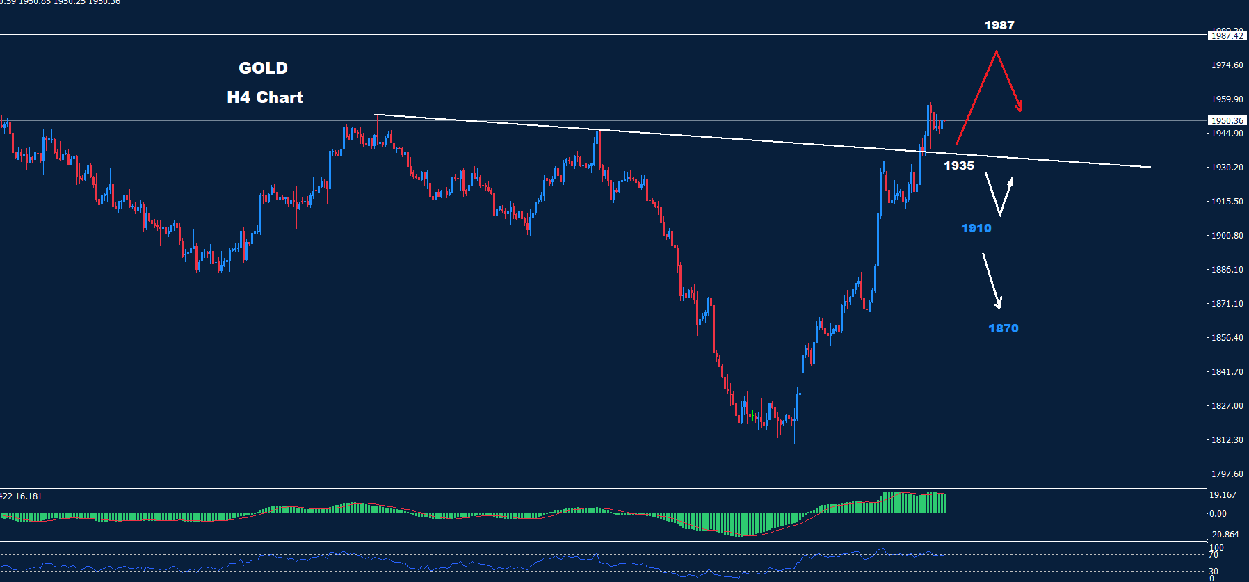 كما نرى على الرسم البياني، يقع الدعم الأول عند 1935 حيث طالما أن السوق يتداول فوقه، فقد تستمر موجة التقدم حيث يواجه السوق مقاومات حول مستويات 1972 و1987.