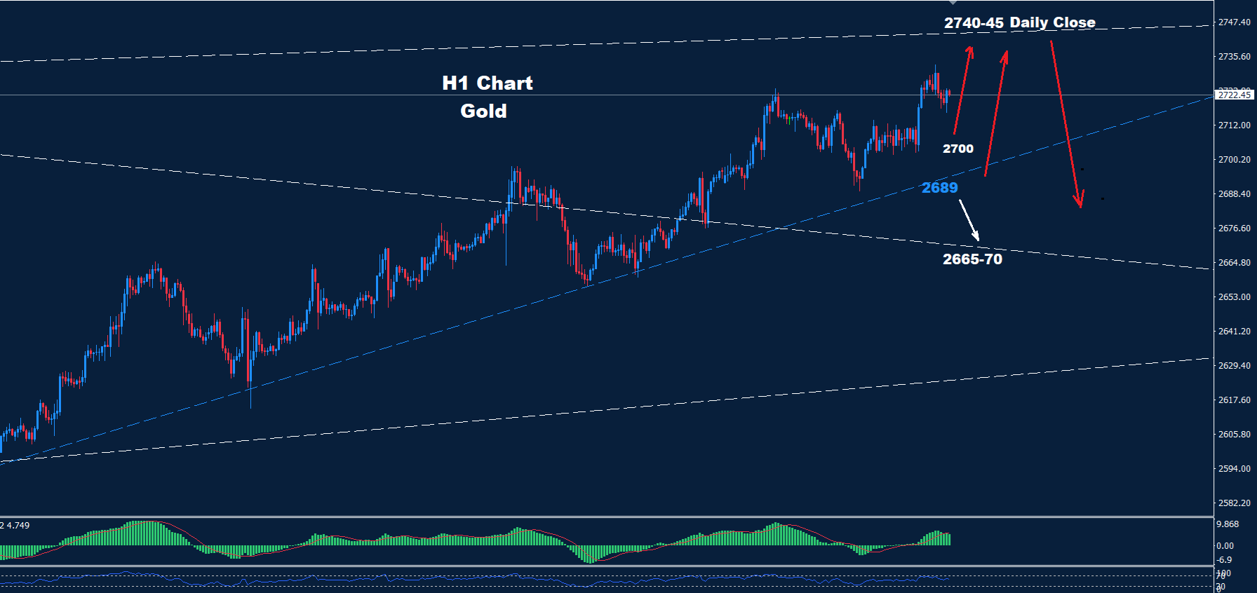 كما نرى على الرسم البياني تظهر مستويات التداول اليومي دعمًا حول 2700 و2689، طالما استمر السوق في الاحتفاظ بالتداولات فوقها فقد تستمر موجة الصعود لاختبار منطقة المقاومة 45-2740