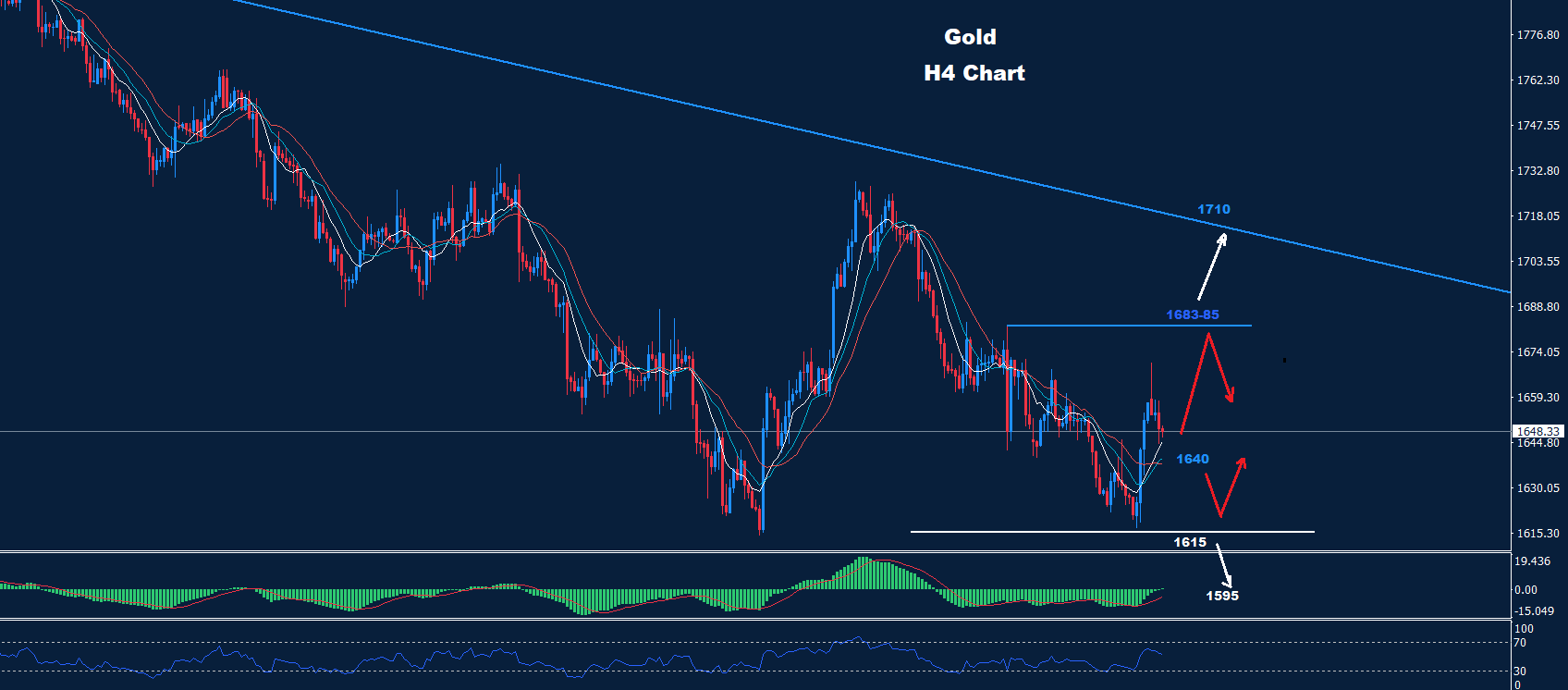 كما نرى على الرسم البياني، يلوح بالأفق منطقة تداول جديدة بين الدعم 1615 والمقاومة 85-1683 مع دعم / مقاومة متوسط حول 1640.