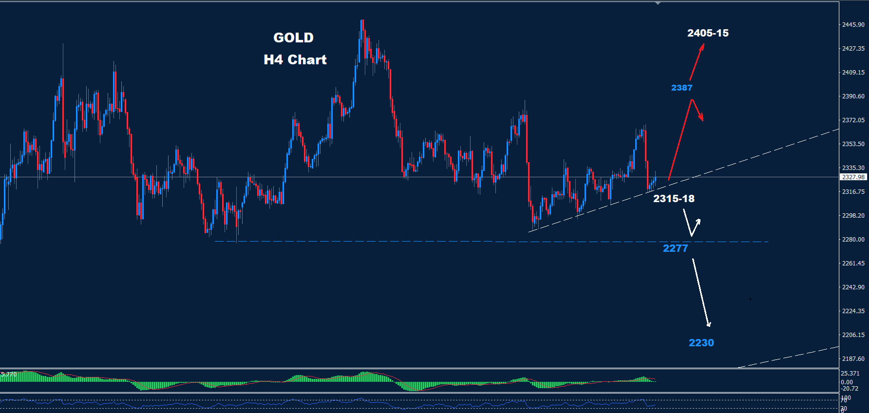 كما نرى على مستويات المدى اليومي ، يواجه السوق أول دعم عند 18-2315 ، حيث طالما استمر السوق في الاحتفاظ بالتداولات فوق هذا المستوى، فإن الحركة الصعودية ستحظى بفرصة نحو منطقة المقاومة 2387